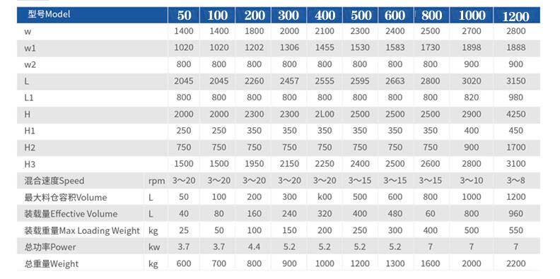 該機(jī)回轉(zhuǎn)體(混合料斗)與旋轉(zhuǎn)軸線成30°夾角,物料在隨著回轉(zhuǎn)體翻動的過程中,同時沿著四壁做切向運(yùn)動,從而達(dá)到最佳的混合效果。